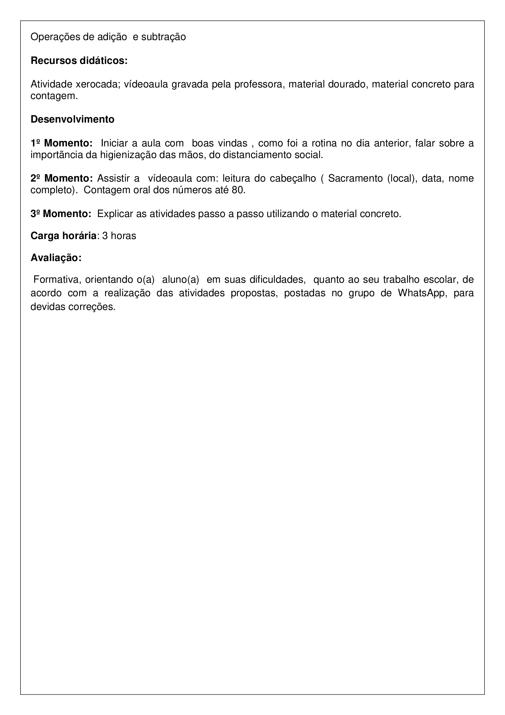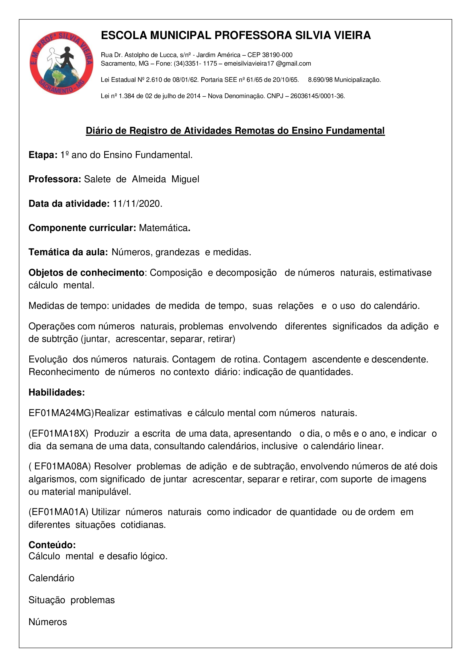 1º ano – MATEMÁTICA: CÁLCULOS MENTAIS E MEDIDAS DE TEMPO