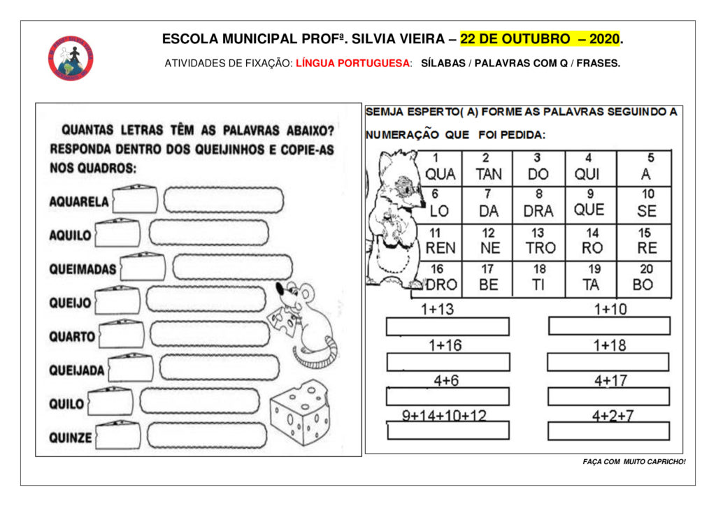 1º ANO – PLANO DE AULA E ATIVIDADES DE LÍNGUA PORTUGUESA/Z/X/Q