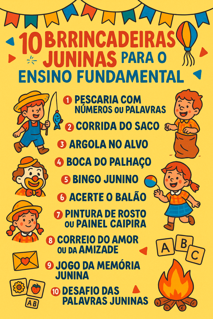 Aqui estão 10 sugestões de brincadeiras juninas adaptadas para crianças do 1º ao 5º ano do Ensino Fundamental, contemplando diferentes faixas etárias e promovendo integração, coordenação motora, raciocínio e diversão: