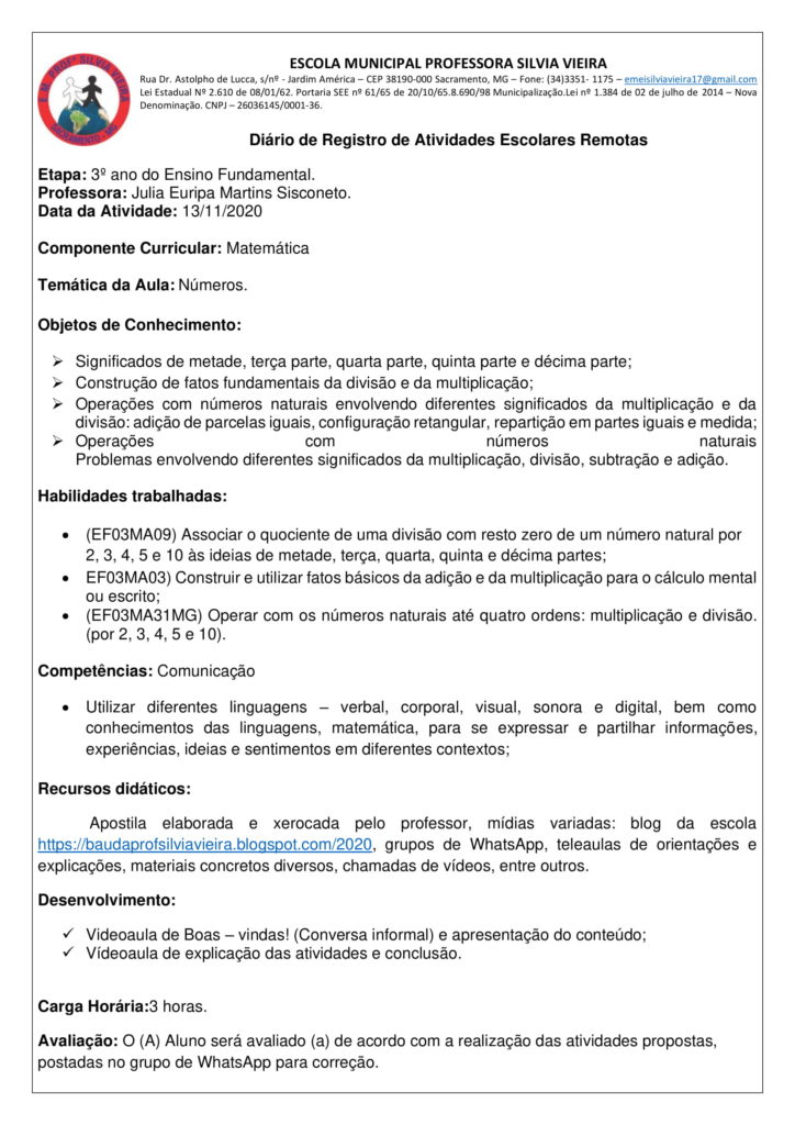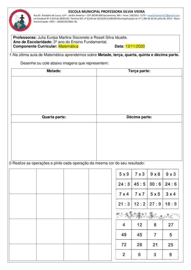 3º ANO – AULA DE MATEMÁTICA E ATIVIDADES: FRAÇÕES/ DIVISÃO E MULTIPLICAÇÃO