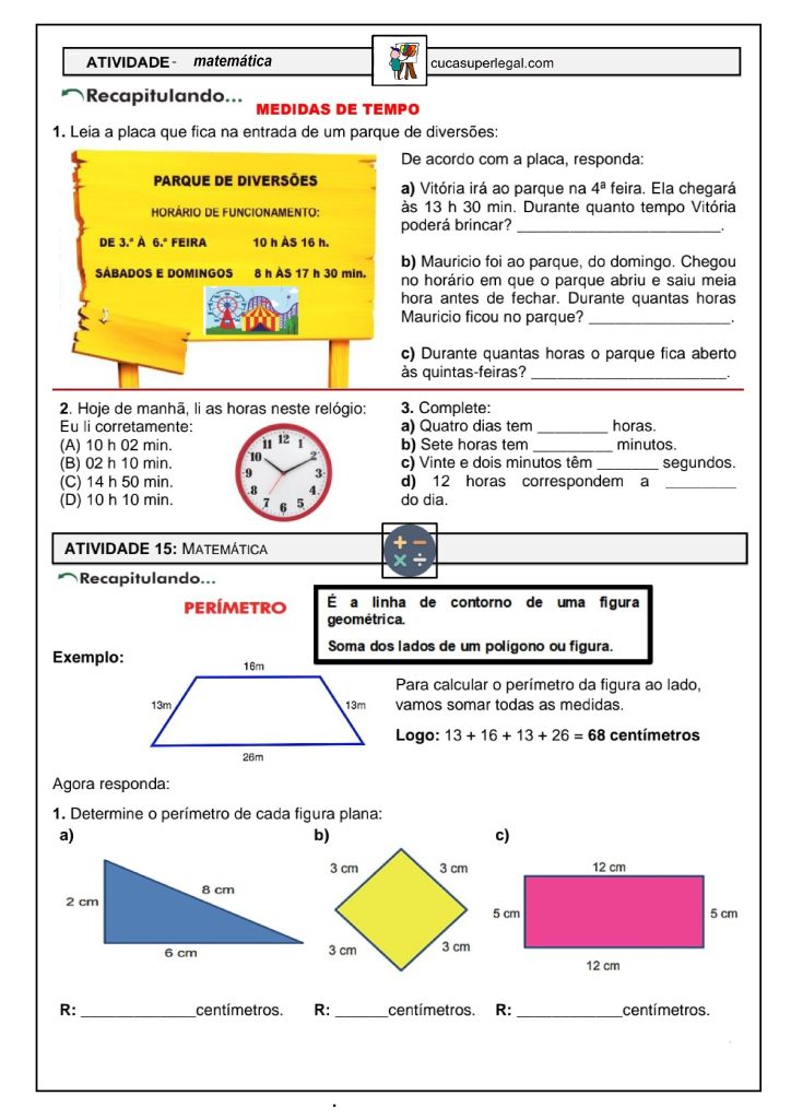 Recursos: Cópias de todas as imagens anexadas, caderno e lápis, relógio (físico ou imagem), régua, barbante (opcional para perímetro).