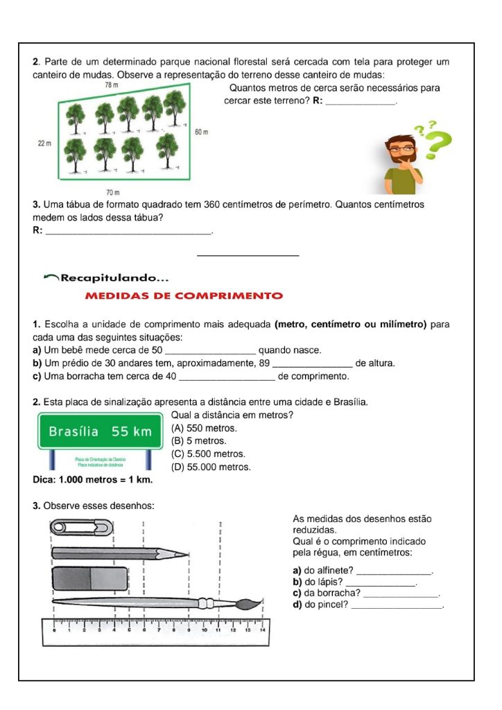 - Explorar a atividade 1 da terceira imagem, discutindo as unidades de medida de comprimento (metro, centímetro, milímetro) e a adequação de cada uma em diferentes situações.