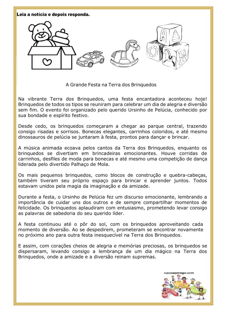 - Texto da notícia “A Grande Festa na Terra dos Brinquedos” (impresso ou projetado)