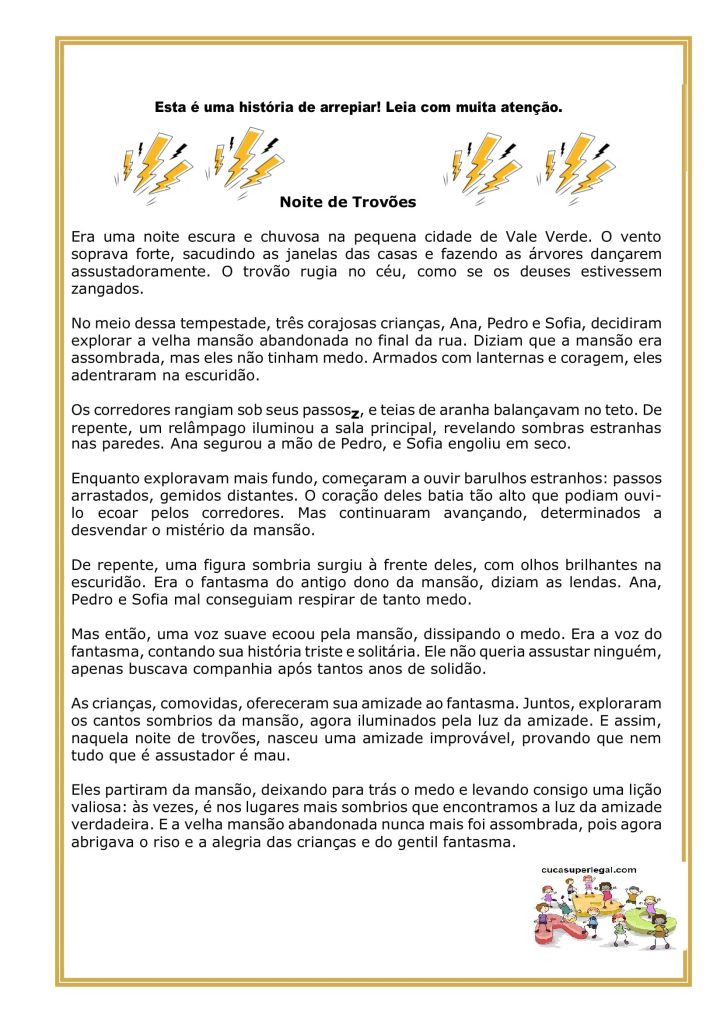 - Realizar a leitura compartilhada do conto “Noite de Trovões”. Incentivar os alunos a prestar atenção aos detalhes que criam a atmosfera de mistério e suspense.