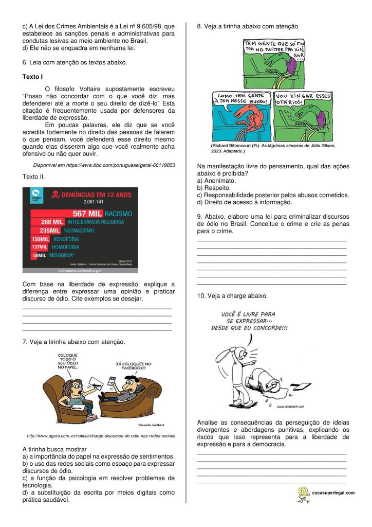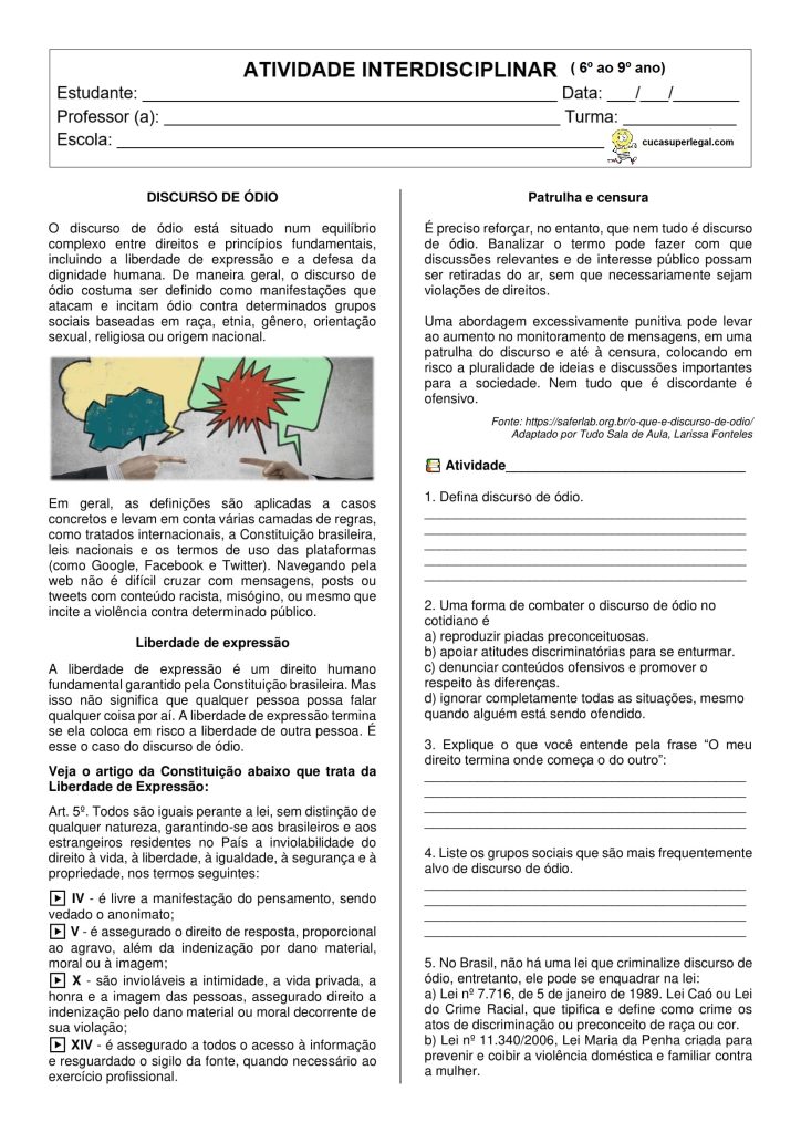 5º ao 9º anos – Atividades interdisciplinares – Contra o discurso de ódio na internet