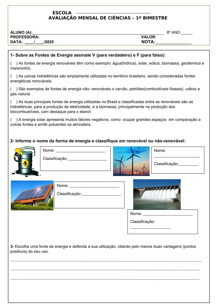 8º ANO – AVALIAÇÃO MENSAL DE CIÊNCIAS – 1º BIMESTRE