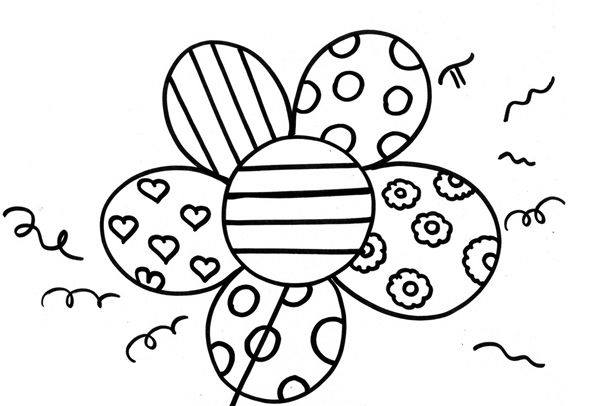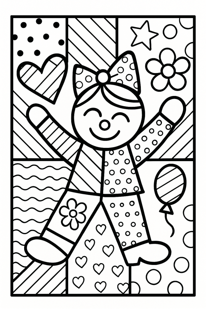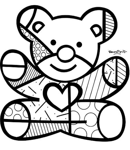 • Cada criança recebe uma folha com o contorno de um desenho inspirado em Romero Britto (por exemplo, um coração grande dividido em várias partes, cada parte com um padrão geométrico descontínuo).