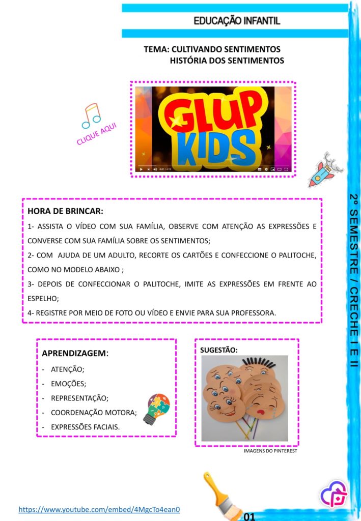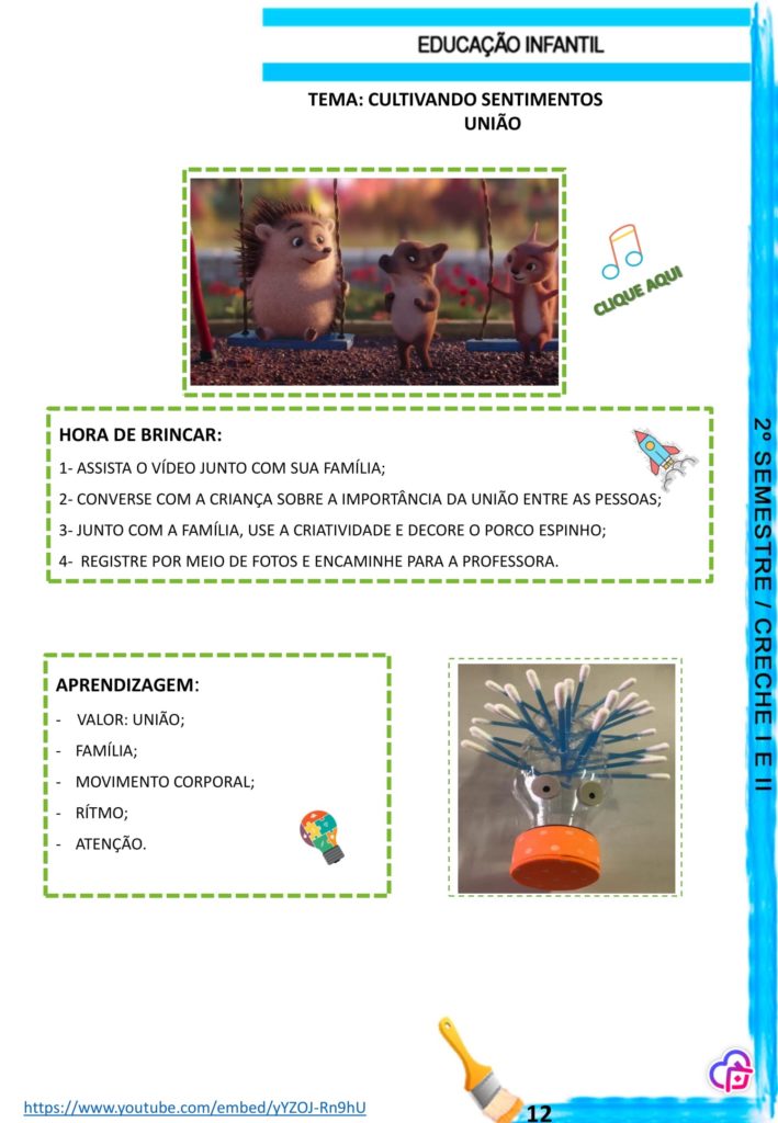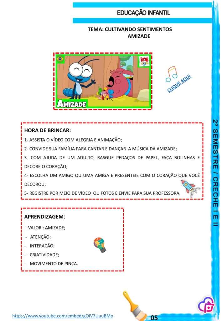 Desenvolvimento: A aula começa com a logo da escola e a música “Tico-tico no fubá”, em seguida a professora fará a introdução da aula enfatizando os cuidados que devemos ter com a COVID-19. Na sequência será contada a história “A galinha Ruiva” que é uma lenda do folclore inglês que trabalha valores humanos. A atividade de registro será a confecção de uma galinha de dobradura e o desenho da paisagem. Por fim será relembrado os numerais e as vogais.