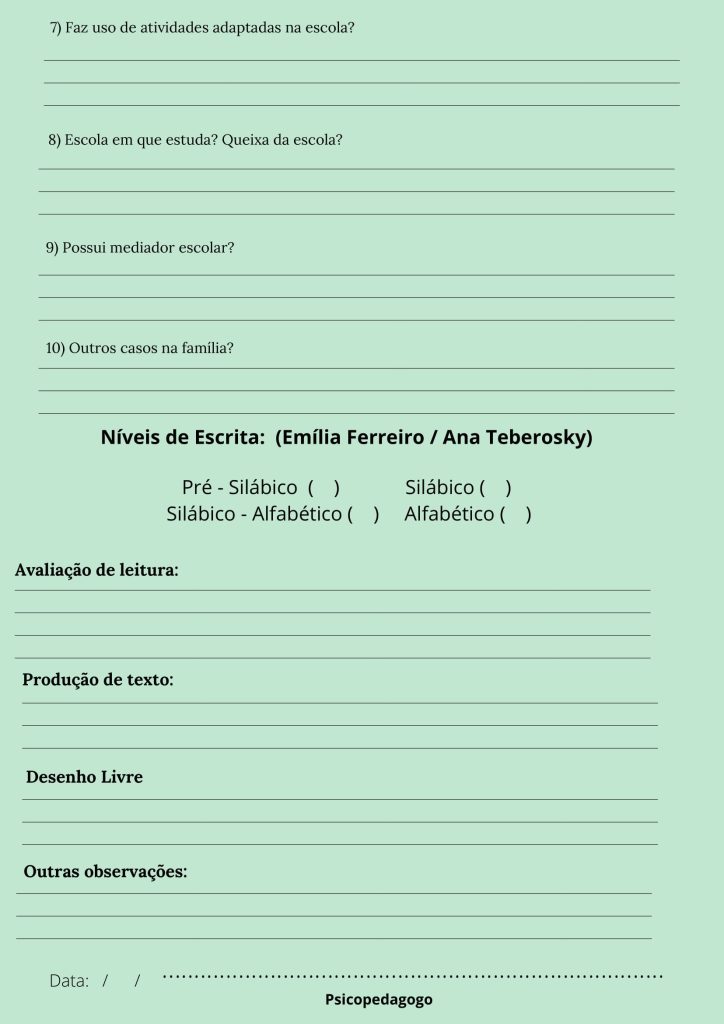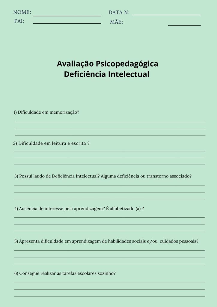 Ficha de Avaliação Psicopedagógica Deficiência intelectual